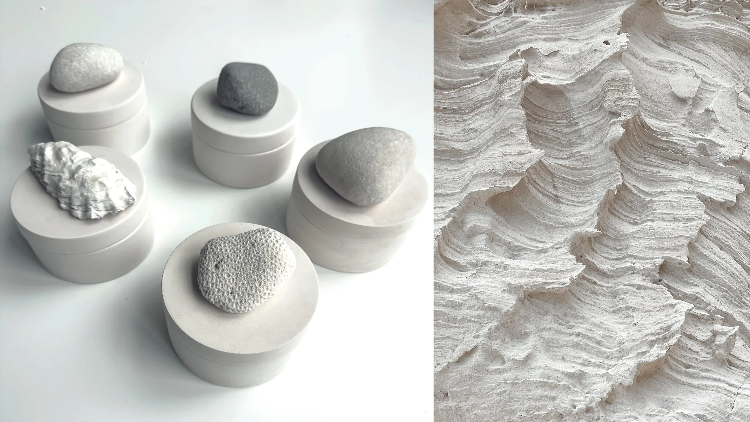 A collection of ceramic boxes, each with a found fragment of nature on top. The shapes are quiet and minimal, and the colours carefully tuned so all attention goes to the treasure that sits on the lid.
