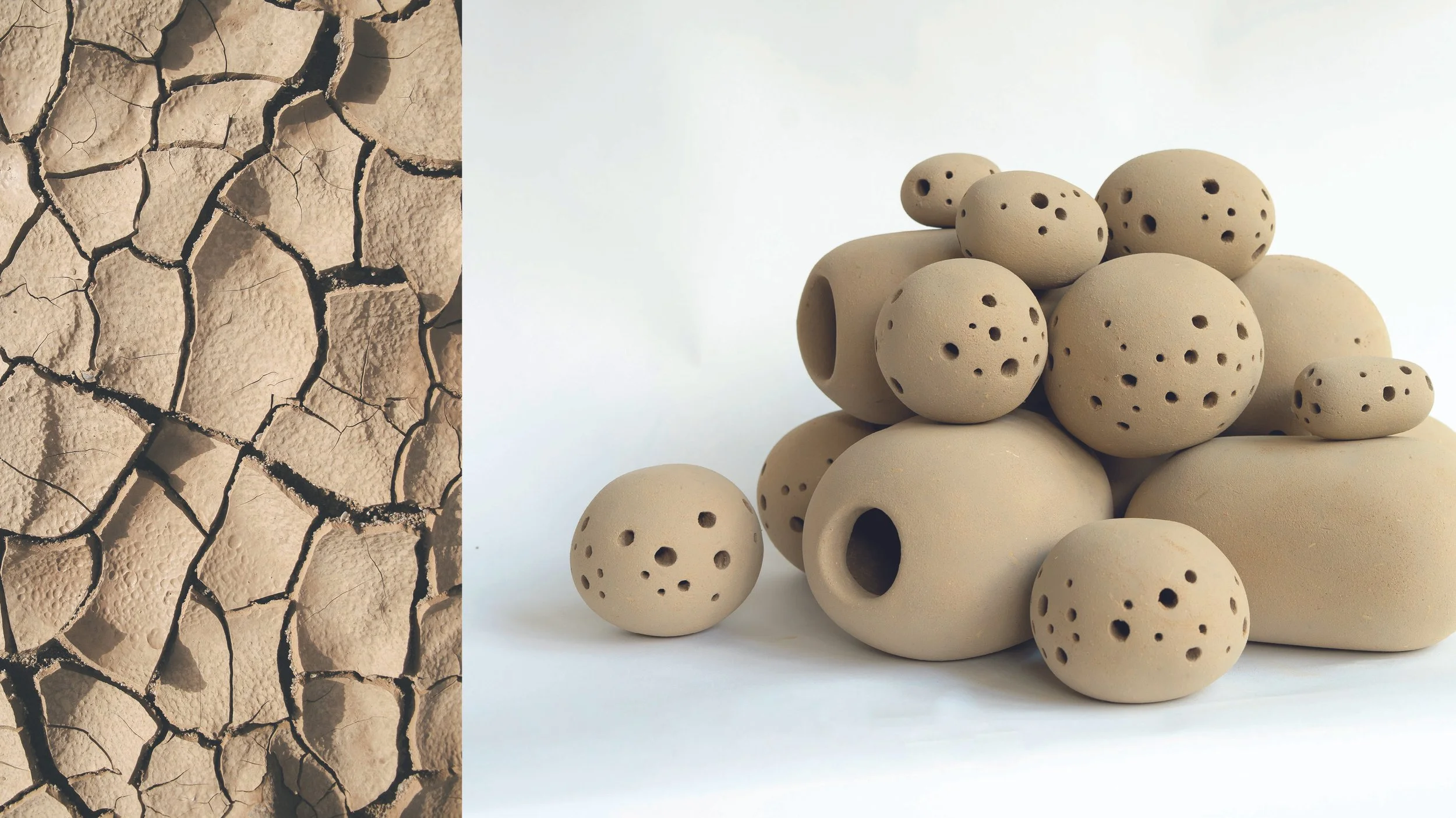 A family of regenerative sculptures with nest and shelter spaces for small animals and insects. Made from unfired local river clay, sand, straw, compost and native flower seeds. Each organic form becomes both habitat and nutrient capsule. A place where new life can grow in and around the clay as it slowly returns to the earth.