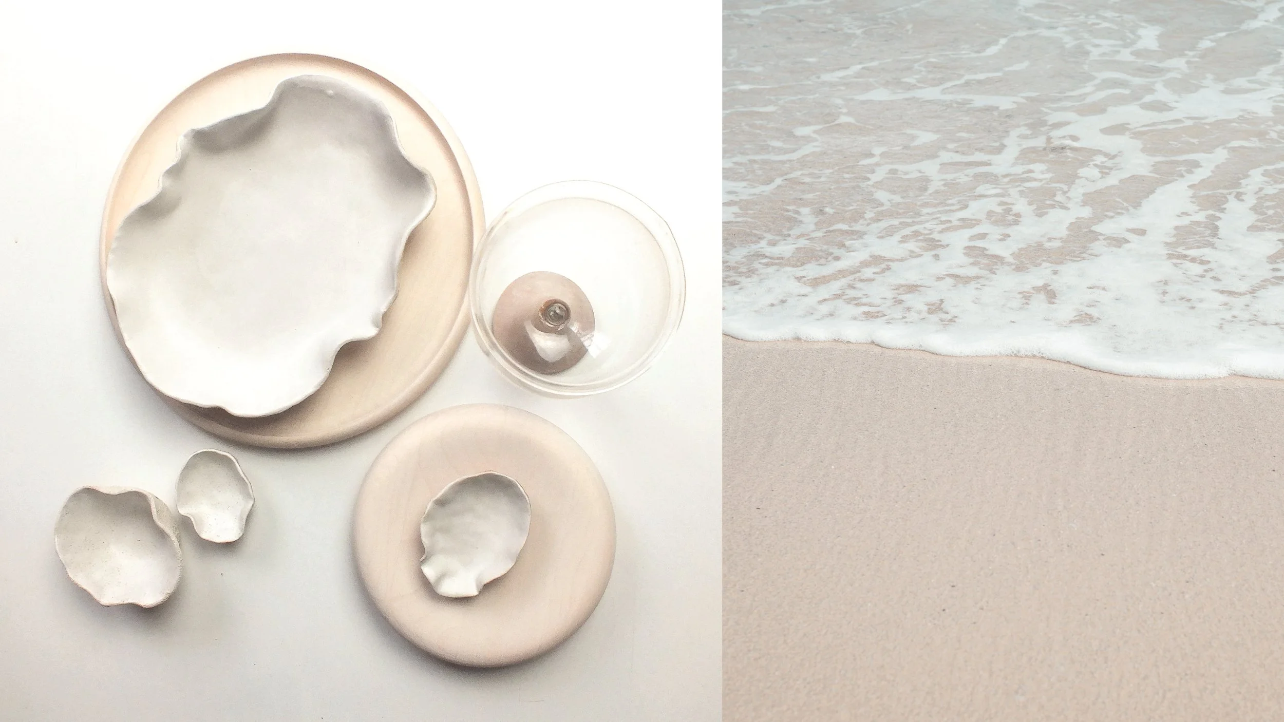 A handcrafted tableware series created by Merging Matter for restaurant Fundamental shaped around the sea terroir. Clay blended with sand and a glaze made with oyster shell and seaweed echo the mineral-rich seabed and tidal shoreline, while white-bleached ash wood elements recall sun-faded driftwood, bringing the open sea to the table.